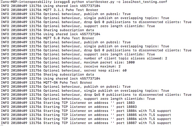 A release of the Eclipse Paho project is planned for June 2018 with its first implementations of MQTT 5.0. I first implemented a broker to test against in the Paho test project. It combines 3.1.1 and 5.0 implementations, and has been used by James Sutton to implement the Java MQTT 5.0 support. It is used in Travis and AppVeyor continuous integration tests for the MQTT 5.0 branches. Example output when you start it up is shown below.